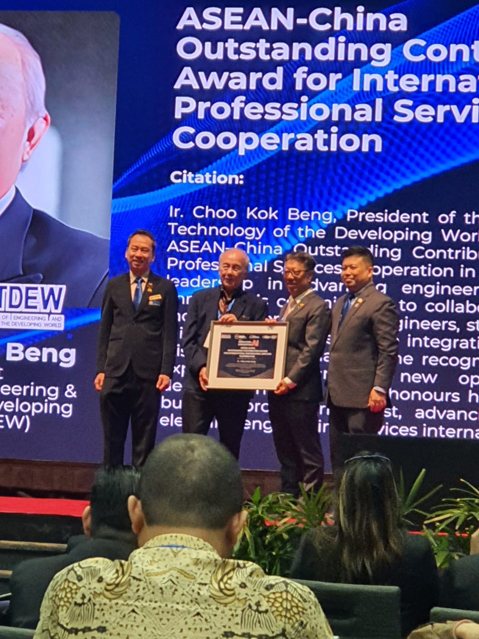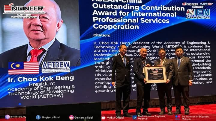 AETDEW President- Ir. Ts. Choo Kok Beng received the ASEAN – China Outstanding Contribution for International Professional Services Corporation during the ASEAN – CHINA AI Convention in conjunction with ENGINEER CONVENTION 2025 on 11 Sep 2025 held at Kuala Lumpur Convention Centre, Malaysia